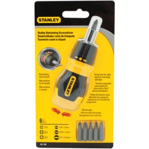 The STANLEY® Ratcheting Multi-Bit Stubby Screwdriver is convenient and flexible. Its three-position switch allows both clockwise and counter-clockwise ratcheting, along with the ability to lock its position. With bi-material handle for comfort and control, and 6 interchangeable bits, this tool is indispensable for your toolbox, workbench, or tool belt.
